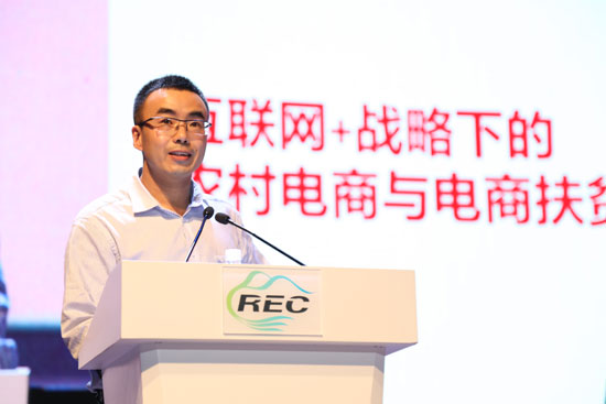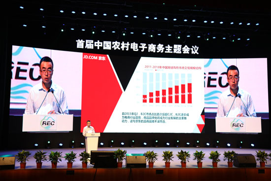 图为京东集团农村电商战略、扶贫战略合作总监阎岩在首届中国农村电子商务主题会议上做经验分享