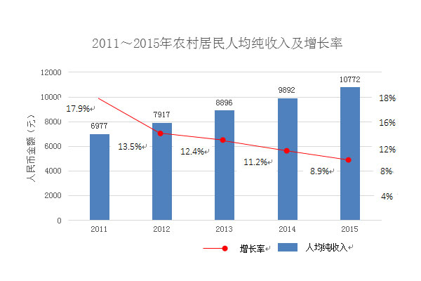 根据国家统计局公布的数据, 2015年,我国农民人均收入突破万元大关,达到10772元,比上年名义增8.9%,增幅连续6年高于GDP和城镇居民收入增幅。“十二五”期间我国农村居民人均纯收入保持着高速增长势头(见下图),虽然每年的增长幅度有所收窄,但依然高于GDP的增幅。农村居民收入的不断提高,自然会拿出更多的收入用于消费。