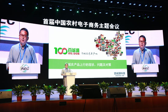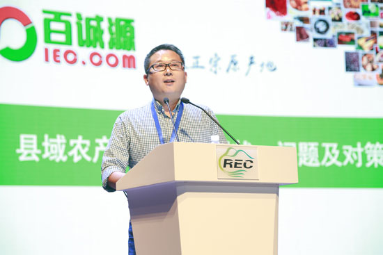 图为百诚源CEO杜非在首届中国农村电子商务主题会议上做经验分享