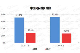 截至2016年6月,我国网民中农村网民占比26.9%,规模为1.91亿;城镇网民占比73.1%,规模为5.19亿,较2015年底增加2571万人,增幅为5.2%
