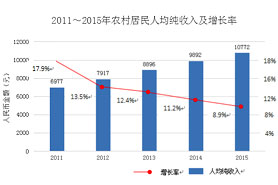 “十二五”期间我国农村居民人均纯收入保持着高速增长势头,虽然每年的增长幅度有所收窄,但依然高于GDP的增幅。农村居民收入的不断提高,自然会拿出更多的收入用于消费。
