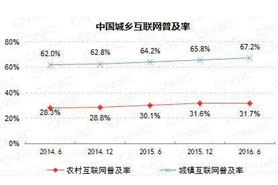 农村互联网普及率保持稳定,截至2016年6月为31.7%。但是,城镇地区互联网普及率超过农村地区35.6个百分点,城乡差距仍然较大。